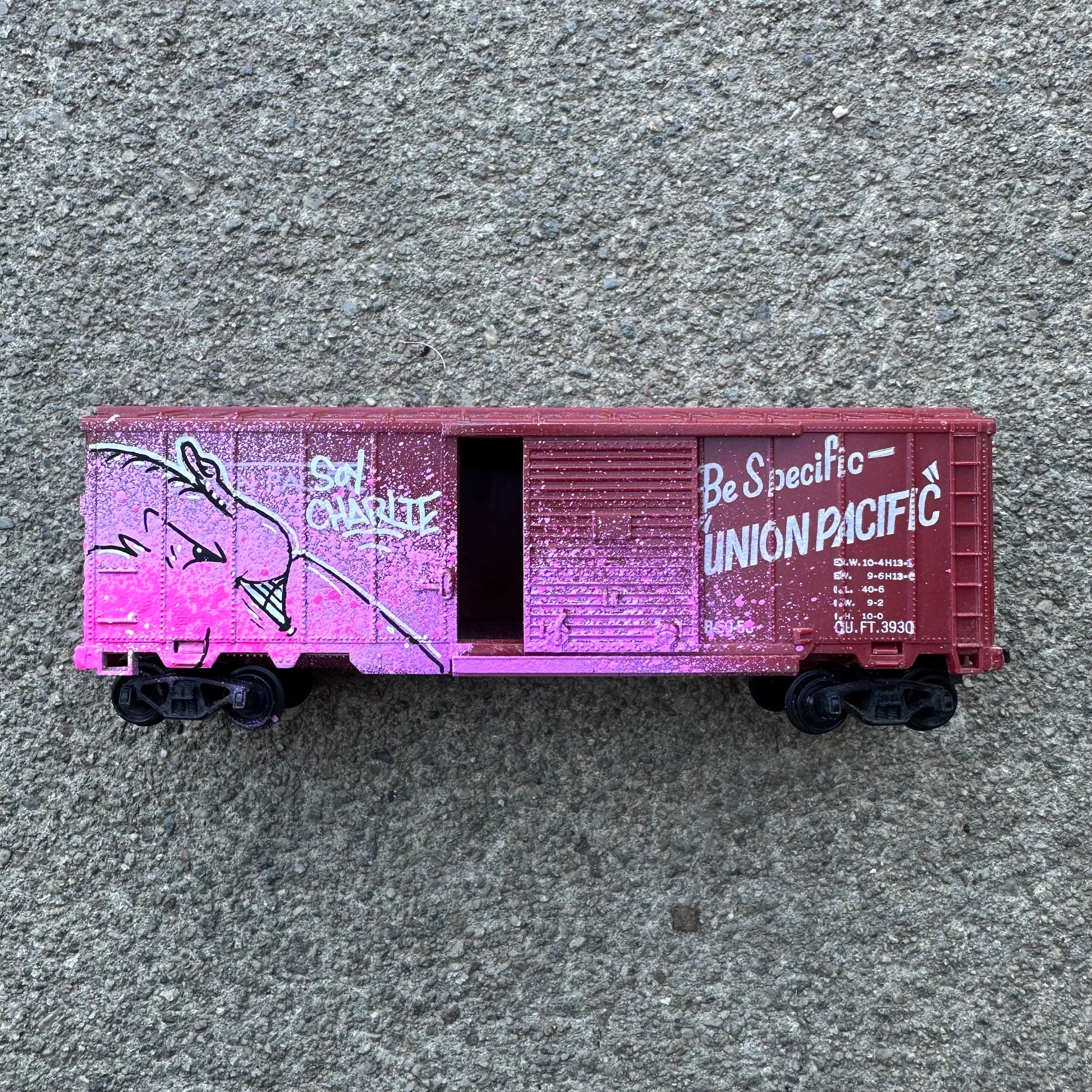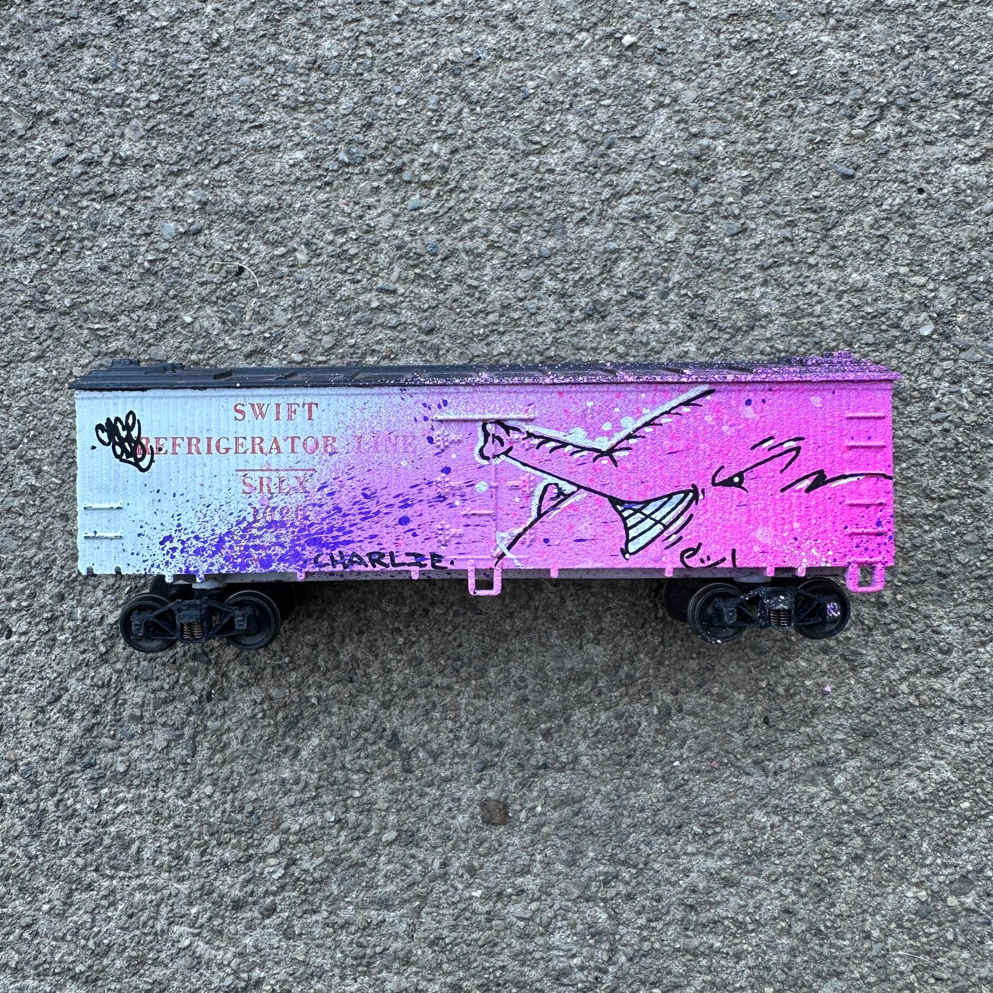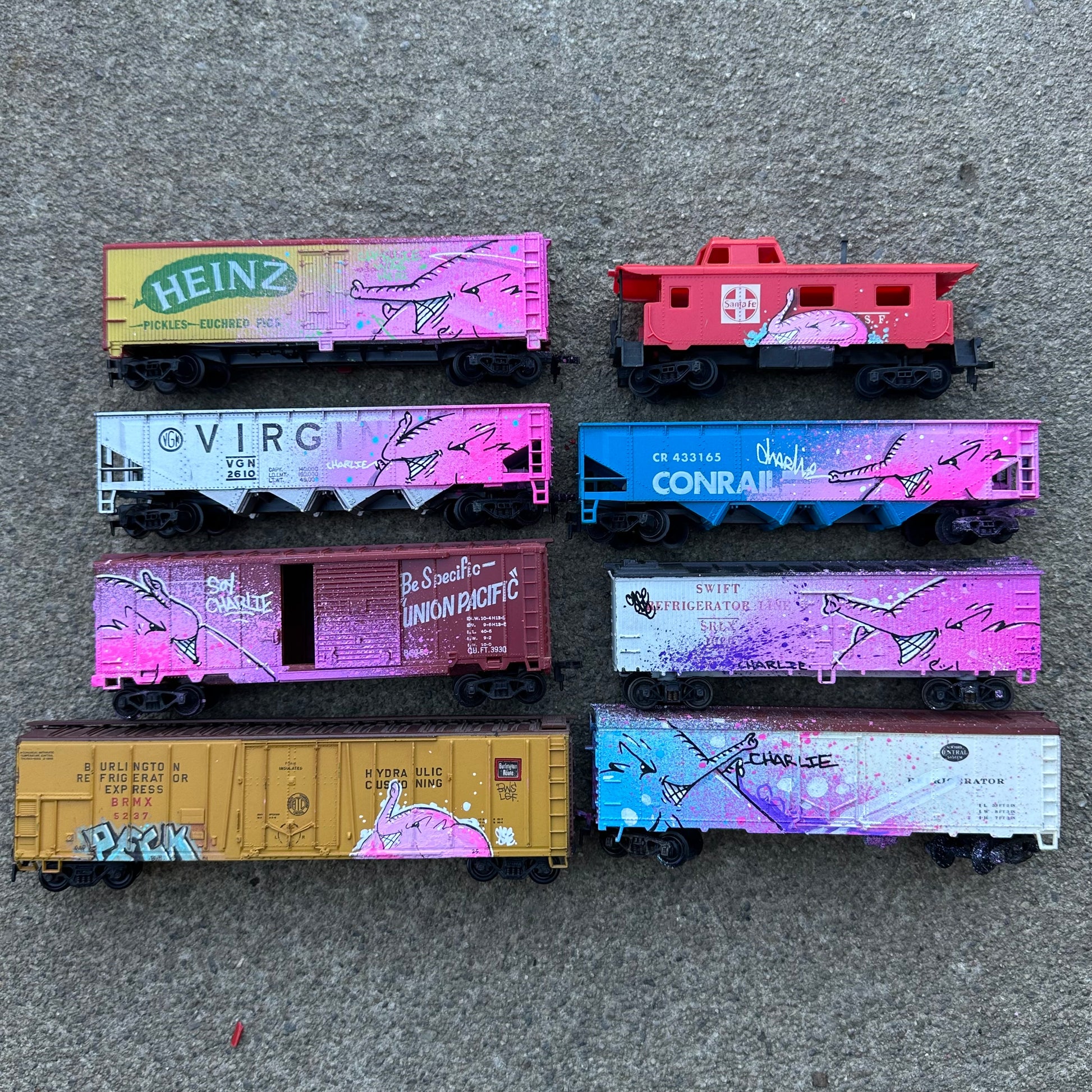 Each of these vintage train cars has been hijacked by Charlie the Angry Elephant 🐘💨—bringing pink fury to the rails! From Union Pacific to Heinz, no car is safe from the graffiti vibes. These mini freights are hand-painted, one-of-a-kind pieces rolling with attitude and street soul. A playful remix of rail history with a heavy dose of spray can swagger.