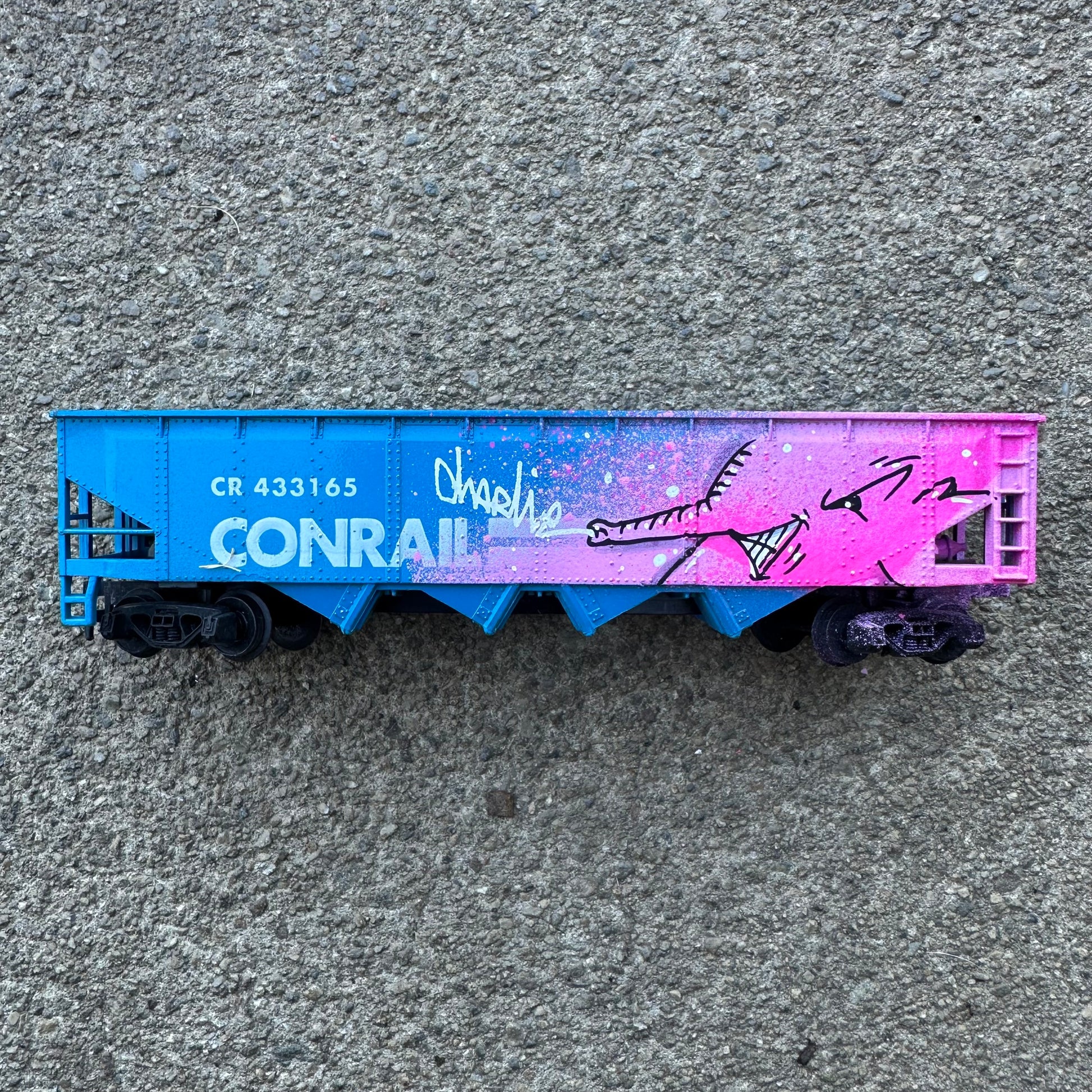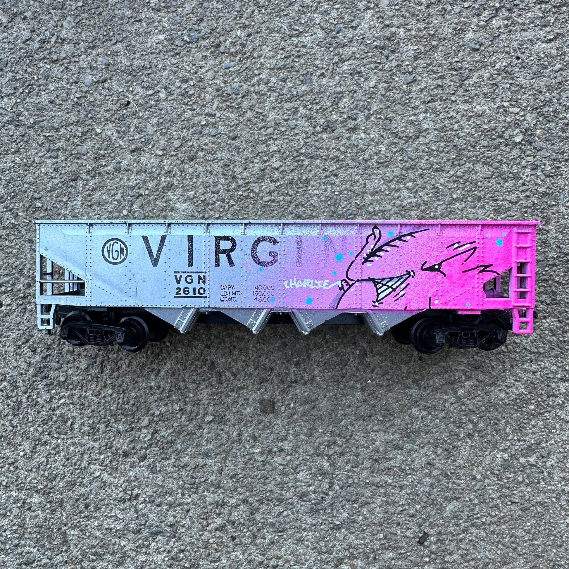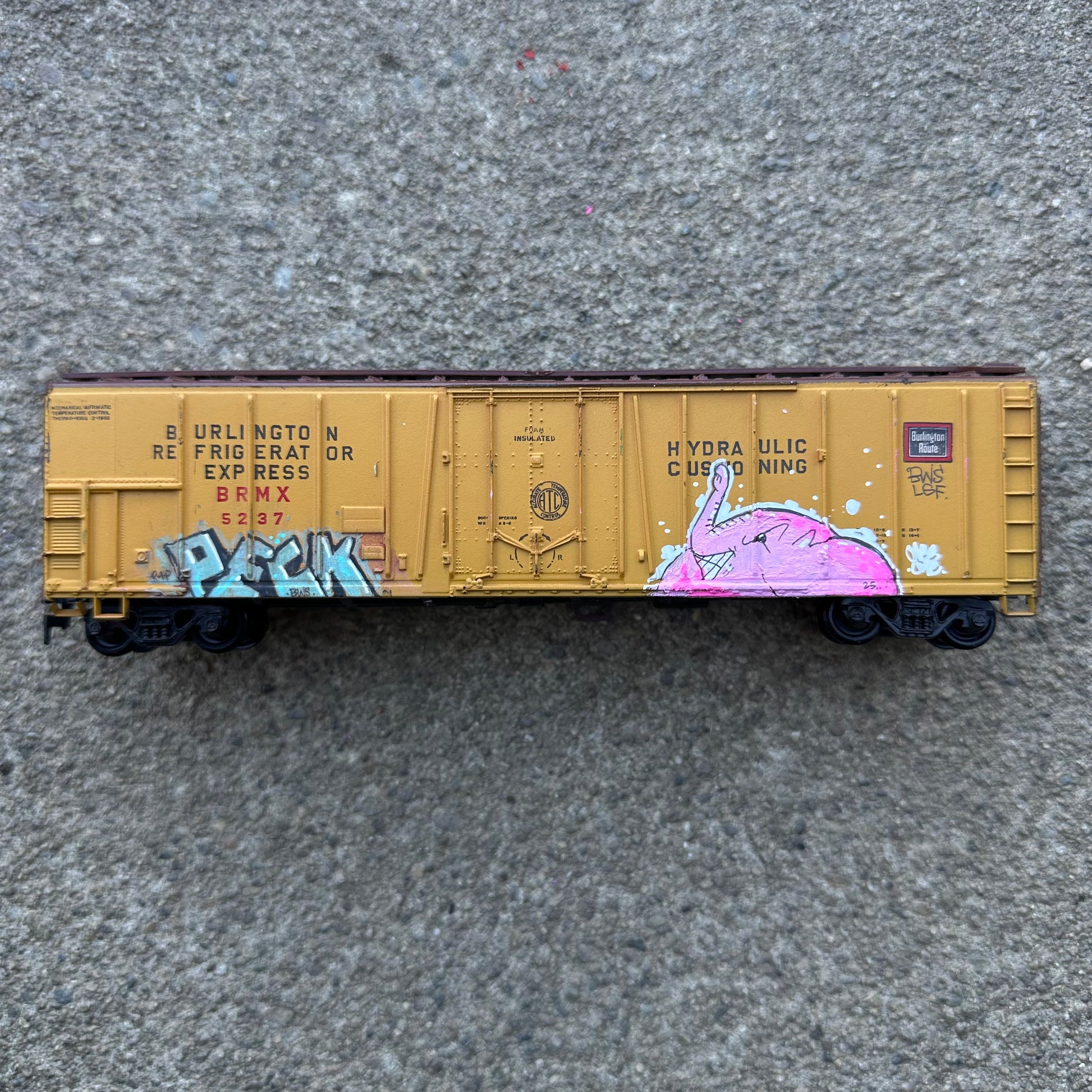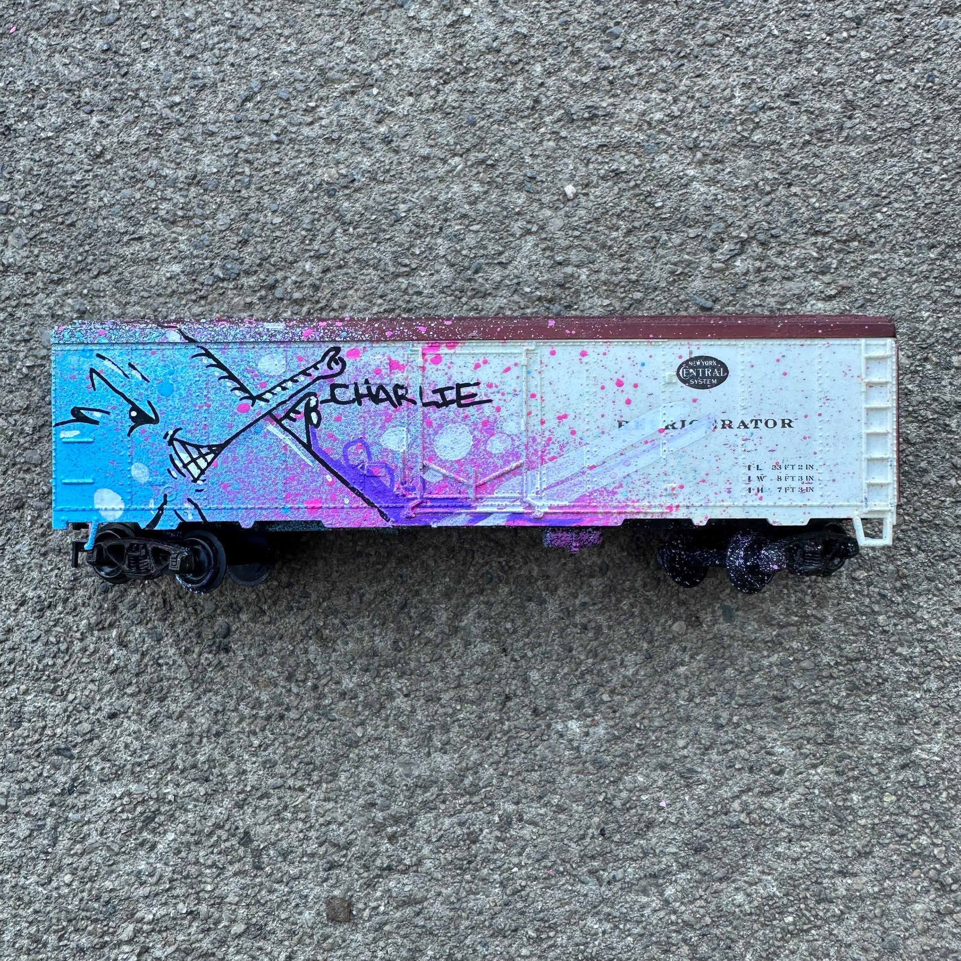 Each of these vintage train cars has been hijacked by Charlie the Angry Elephant 🐘💨—bringing pink fury to the rails! From Union Pacific to Heinz, no car is safe from the graffiti vibes. These mini freights are hand-painted, one-of-a-kind pieces rolling with attitude and street soul. A playful remix of rail history with a heavy dose of spray can swagger.