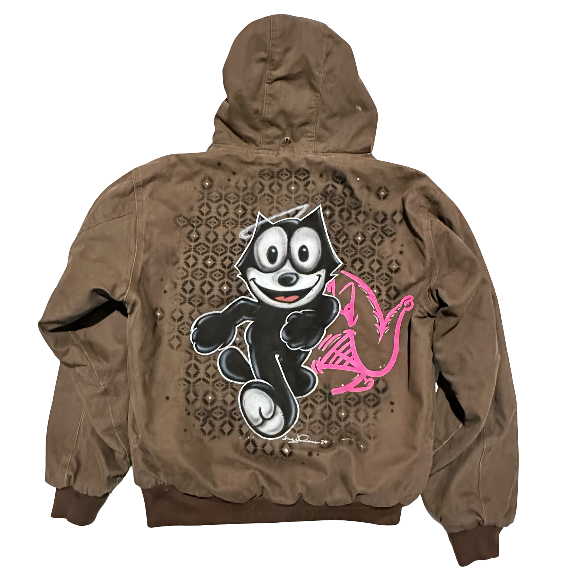 A unique vintage XL jacket featuring a bold, hand-airbrushed Felix the Cat design with pink graffiti accents. One-of-a-kind streetwear with classic cartoon style and vintage character.