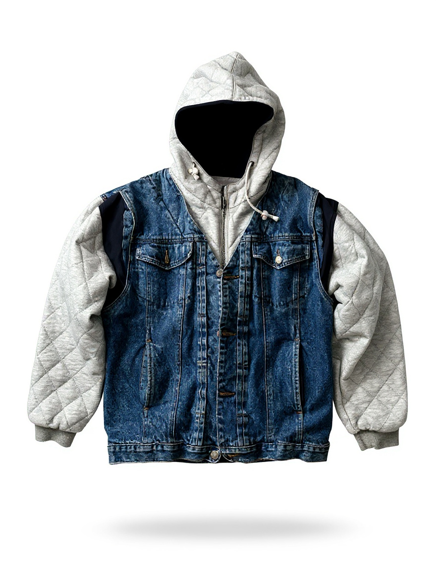 This piece starts with a vintage Arizona Jean Company denim jacket and features quilted grey hoodie sleeves for added comfort. The back is hand-airbrushed with a detailed Betty Boop design, finished with soft splatter effects for texture. It’s a unique, one-of-one jacket with a cozy feel and a classic, custom look.