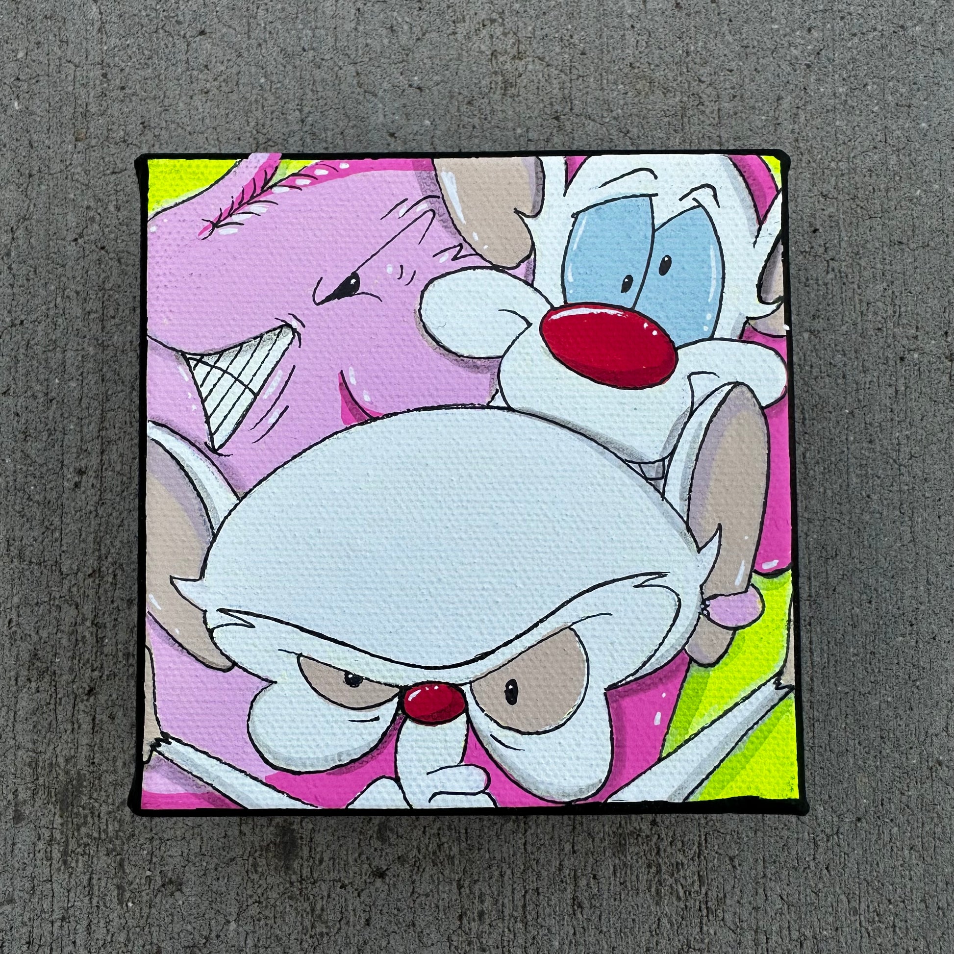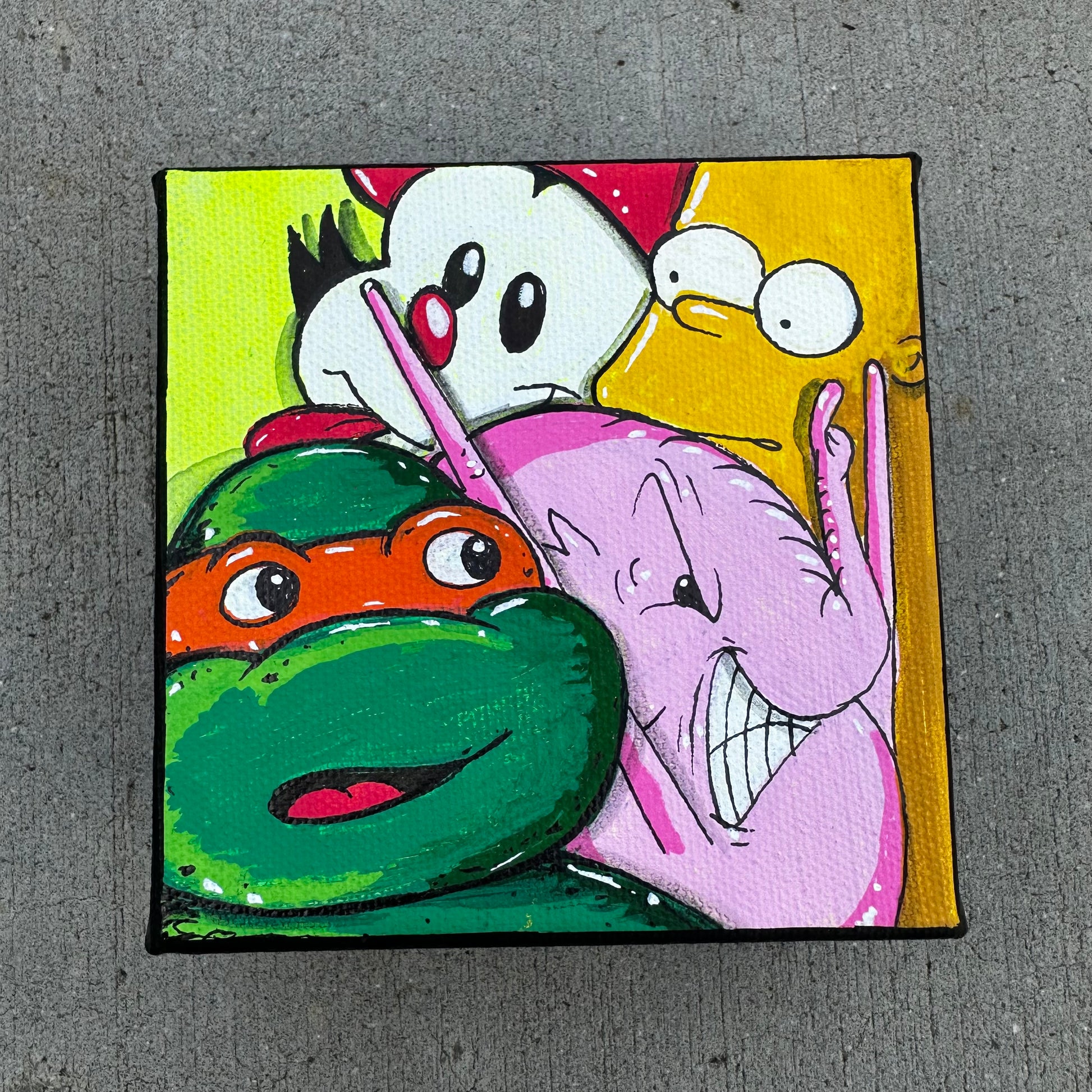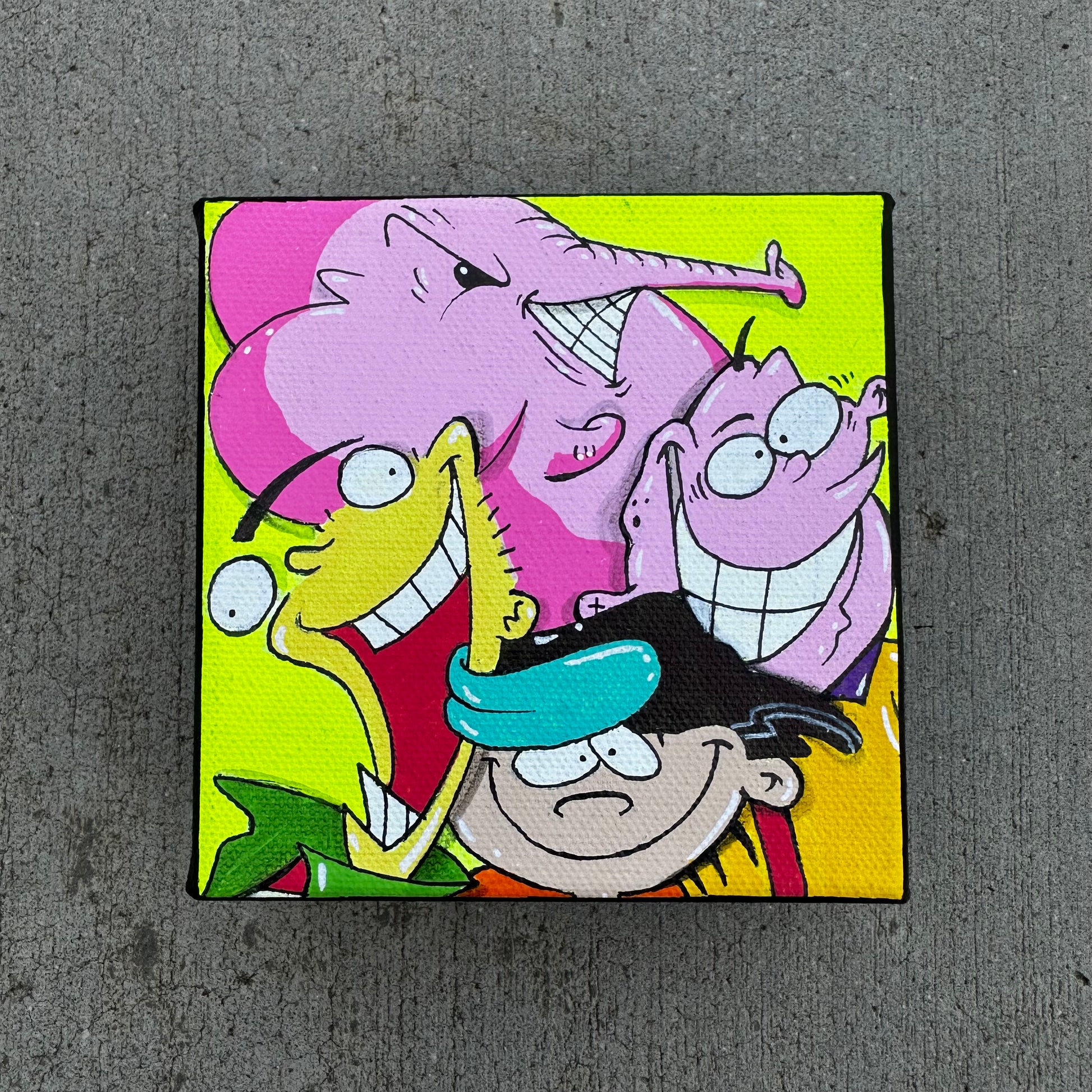 This vibrant painting set brings together the best of nostalgic Saturday morning cartoons with a modern street art twist. Each mini canvas features classic characters like the Ninja Turtles, Rugrats, Ed, Edd & Eddy, Pinky and the Brain, and more — all playfully interacting with Charlie the Angry Elephant. The bold colors and expressive faces create a fun, chaotic energy that celebrates childhood memories while showcasing Charlie’s signature style. Perfect for fans of retro cartoons and collectors of one-of-a-kind pop culture art.